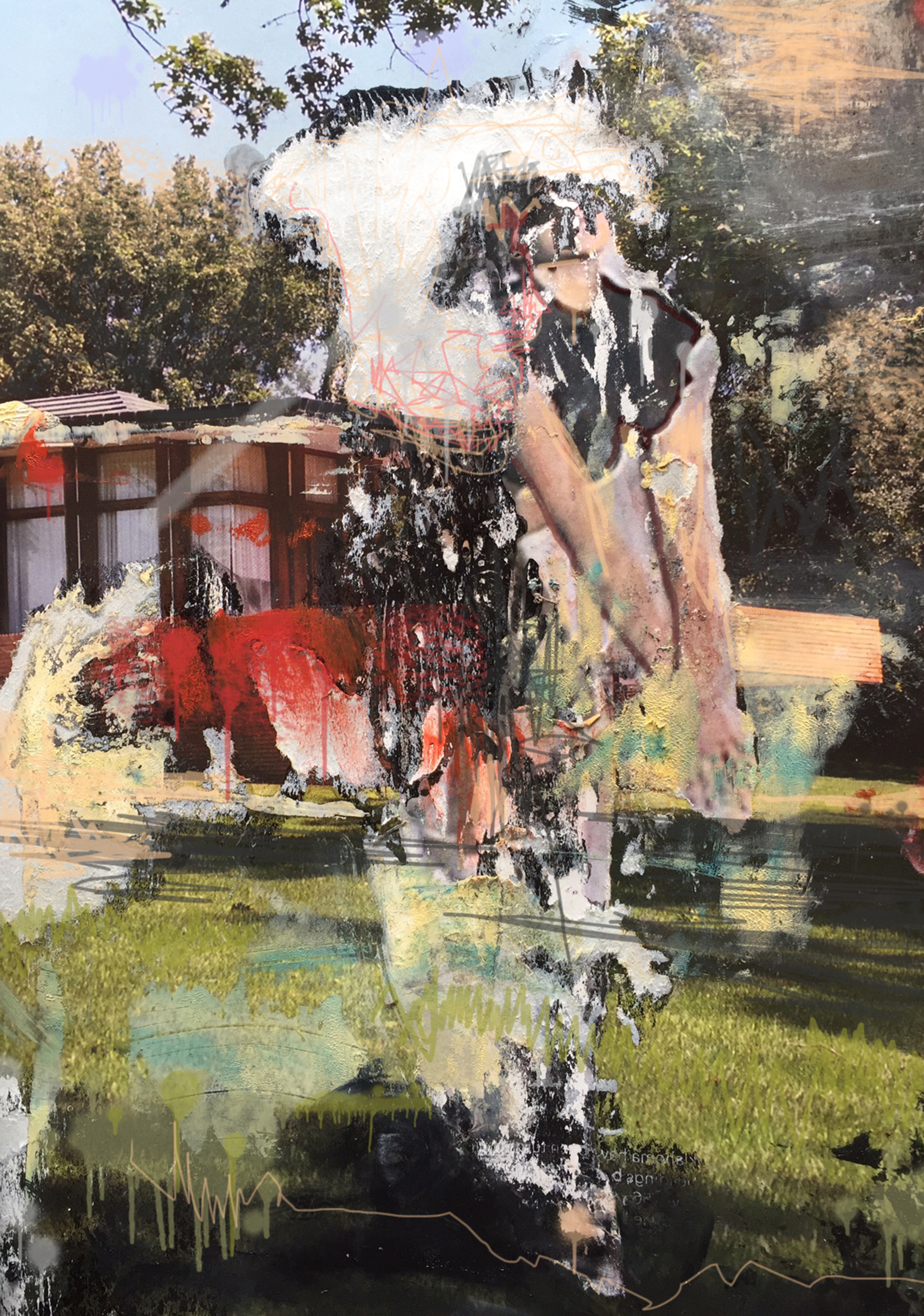 "He woke up with sunshine on his mind and music streaming in through net curtains. As his eyes blinked, he suddenly remembered that he was in Malibu in the middle of the afternoon and that meant only one thing. He slid open the door and stepped out into a fluorescent green lawn, light bouncing off light. He shut his eyes and started to dance and dance and dance. Malibu daylight dancing was always the best and he had forgotten how good it felt. Break dancing in the back yard, he was lost in a world of flora and fauna; a blur of hedonistic dancing joy. He was in sunny Malibu and he could forget about everything for one more day…"I love this piece; it has such an energetic and happy dance feel to it; even more so because he is dancing around the garden!New series of digital collage inspired by the faded glamour of L.A. lost lives and glitchy lifestyles...