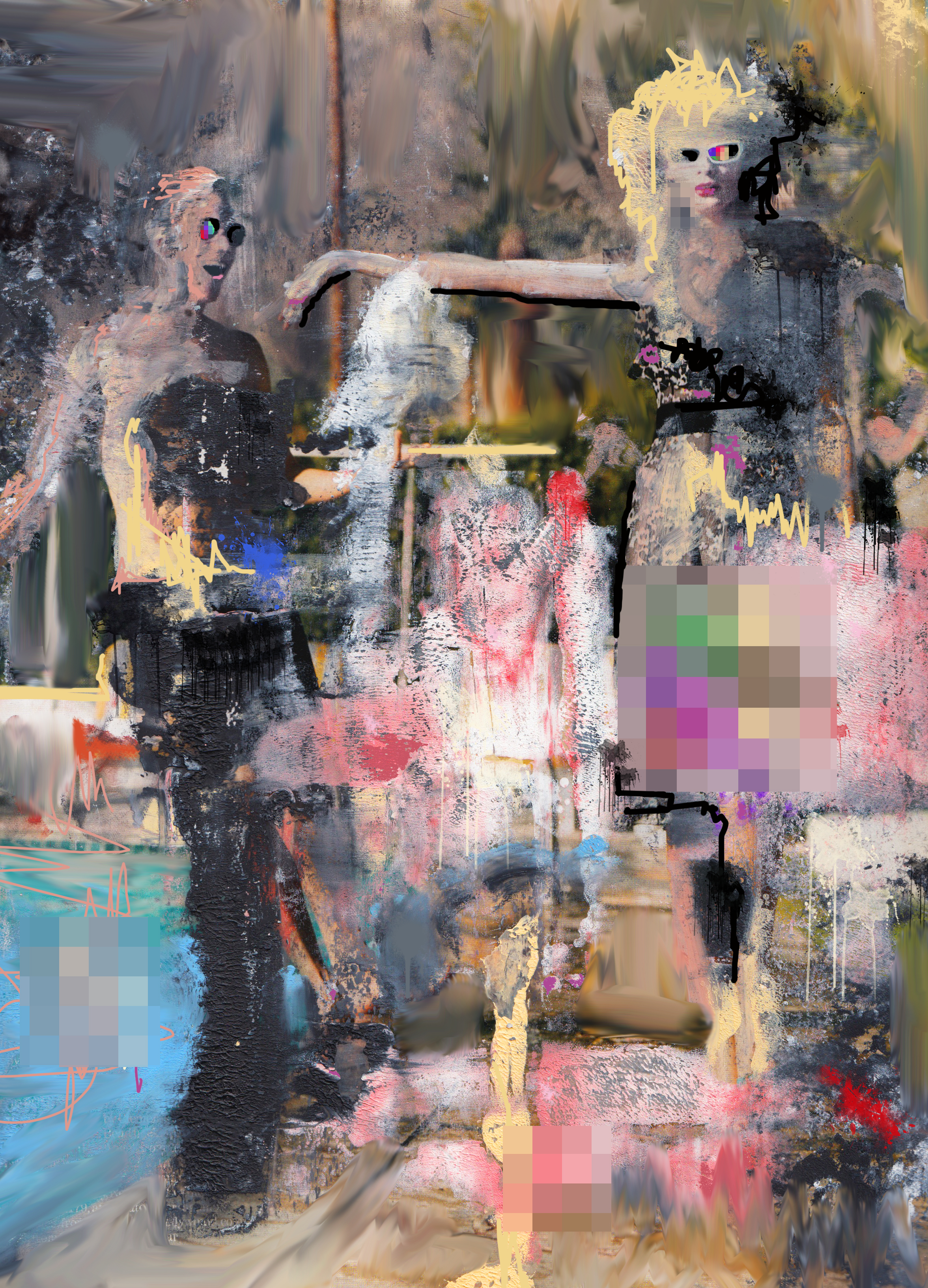 "Pool party pixels flying around this sunny afternoon up in the Hills. Push you into the pool, try not to slip. Pose for the camera, adjust your million dollar stare. Reality starts to disintegrate as the sun beats down. Pixelate me into a better version of myself. This is Beverley Hills, baby, and I need to look my best."This is part of a series of dysfunctional digital paintings that I have made about distorted lives in Hollywood called "Hollywood Pixelations".